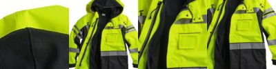 • Removable zip up hooded sweatshirt with two slash pockets and reflective bands on left arm