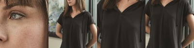 • Single-needle topstitched back neck