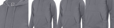 9 ounce 60% cotton/40% polyester athletic fleece ; Jersey-lined hood; Set-in sleeves ; Front pouch pocket ; Rib-knit cuffs and bottom band; No drawcords;