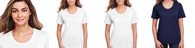 4.5 oz/yd2 / 160 gsm, 100% polyester jersey; Moisture-wicking and antimicrobial properties; ChromaSoft™ technology combines the colorfastness of cationic dyes with soft cotton-feel performance; Tear away label; Fashion forward scoop feminine neckline; Active fit; Easy care;